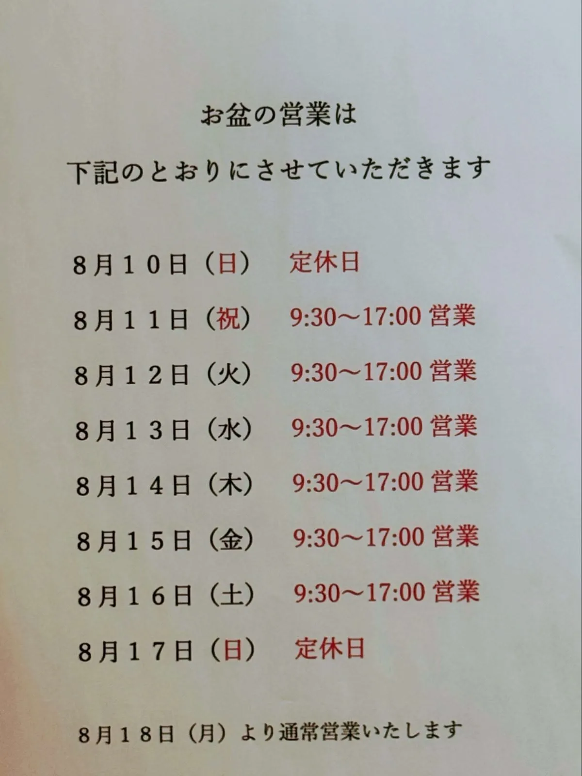 明日よりお盆時間営業となります